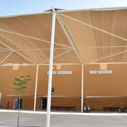 • مظلات القماش المشدود (PVC/HDPE): خفيفة الوزن، مرنة، تسمح بمرور الهواء وتقلل من درجة الحرارة.